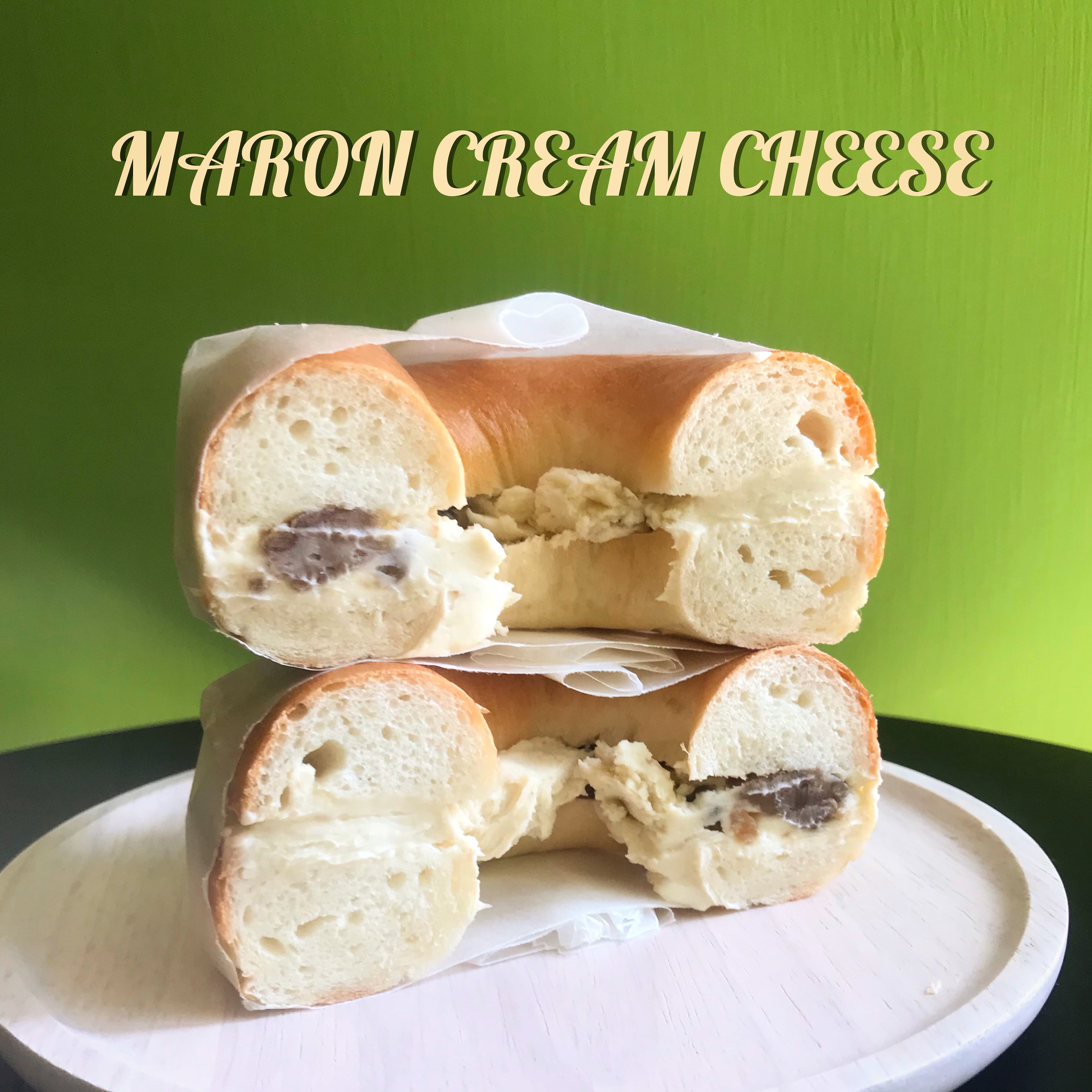 秋の味覚「栗」と北海道産クリームチーズを絶妙に合わせて甘じょっぱい味に仕上げました。プレーンベーグルに挟んで食べやすいよう半分にカットしてあります(まるまる一個での販売)。