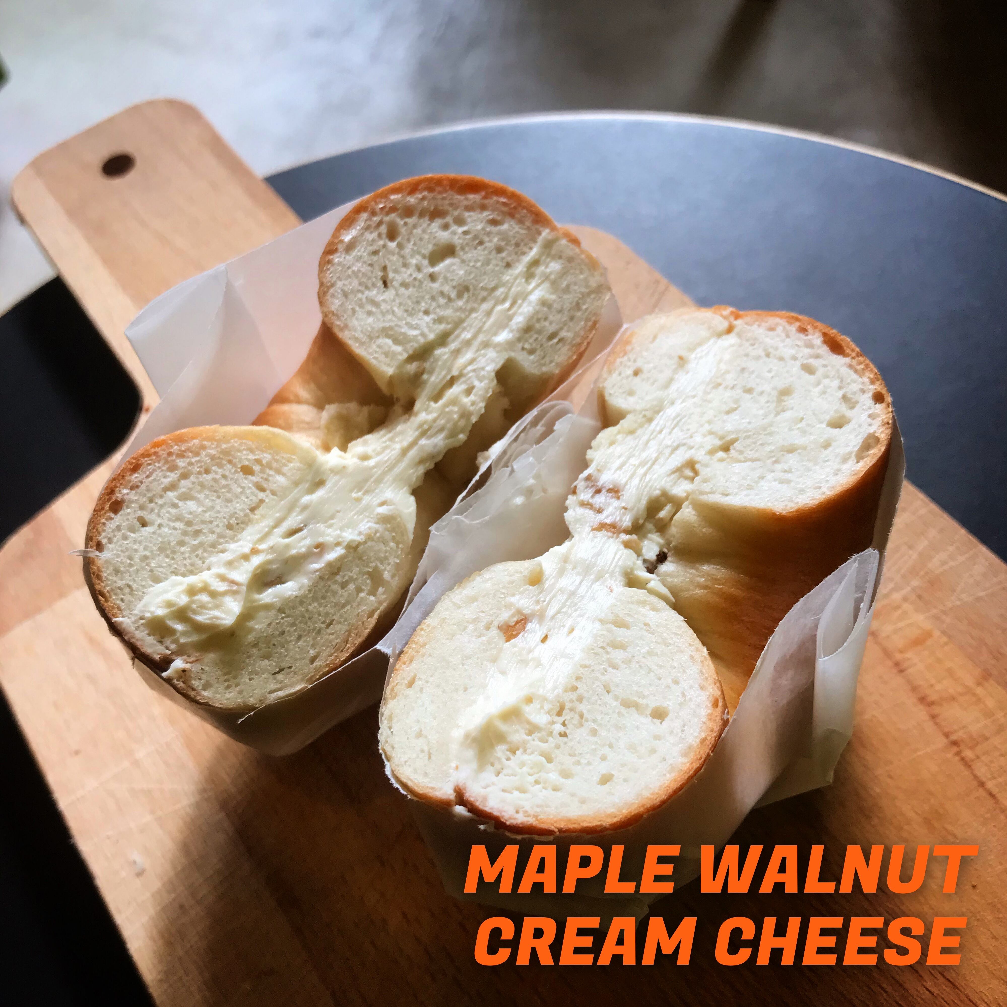 有機メープルシロップの優しい甘さにウォルナッツとクリームチーズを合わせ、コクのある甘さとクルミの食感がぜいたくな味わい。プレーンベーグルに挟んで食べやすいよう半分にカットしてあります。